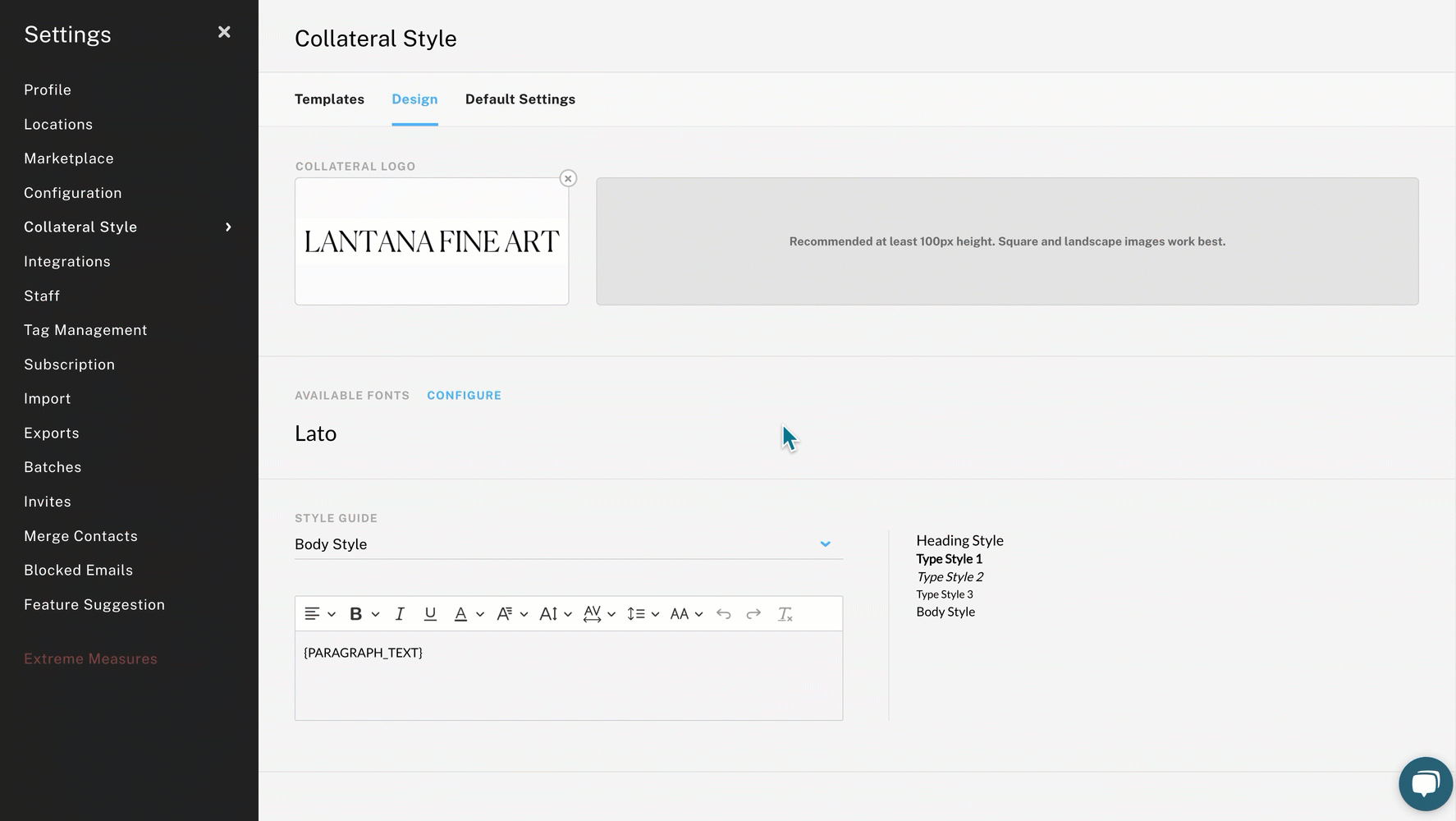 Use the Design tab to set the overall style of your collateral. You can upload your logo, configure fonts, and customize type styles.
