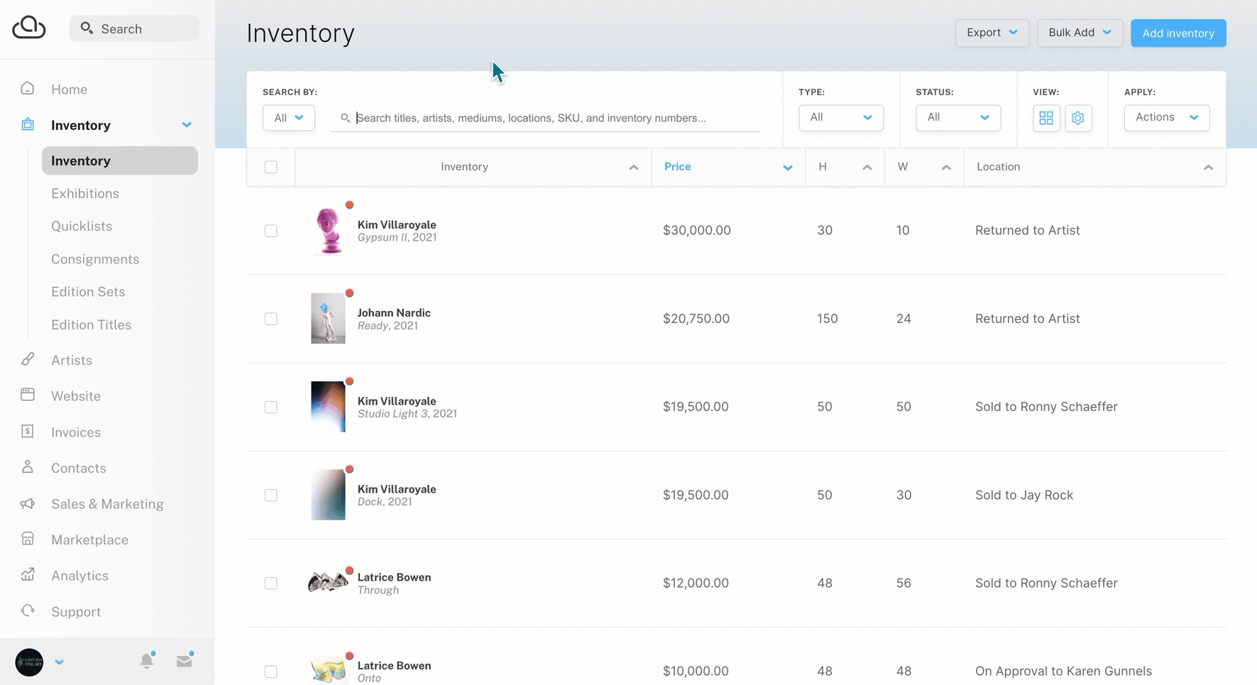 Search ArtCloud records to check for duplicates and existing Artists, Inventory, Contacts, and more.